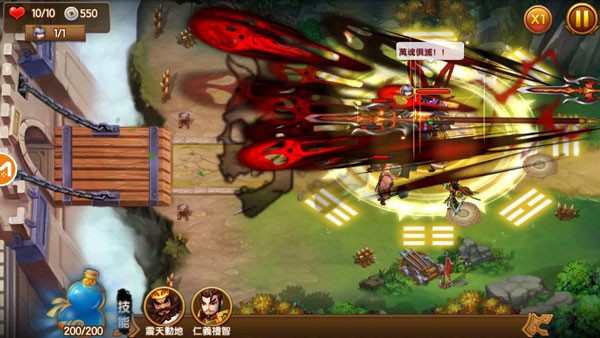 游戏采用经典的塔防机制,操作直观又富有策略性。战斗开始前,玩家通过点击旗帜选择上阵武将;战斗中,技能需从左下方拖拽释放,灵活应对敌军波次进攻。点击武将可进行实时升级或销毁操作,核心目标是抵御敌军一波接一波的猛烈攻势,守住防线赢得胜利。