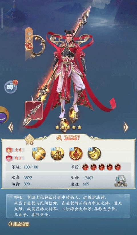 作为火系阵营中的顶级输出之一,哪吒在100级时便拥有高达3892的攻击力、17407的生命值、890的防御与665的速度,面板数据稳居火系前列。更重要的是,他属于金色品质中较易获取的角色,平民玩家通过常规抽卡即可稳定培养。