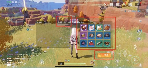 8. **饱食度系统**:点击圆形图标打开食物栏,脱战时可消耗饱食度自动回血。几乎所有食物都提供饱食度,仅耐力类食物例外。