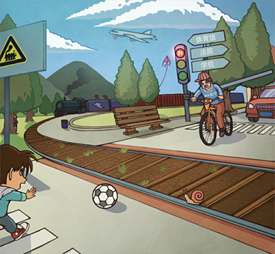 第4关:还原校外事件真相——点击体育馆指示牌、红灯、穿校服的骑车人、驶来的火车,以及捡足球的小朋友。