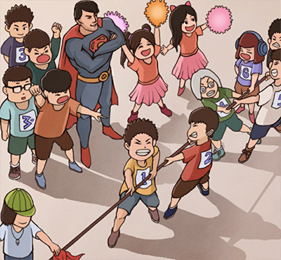 第9关:拔河比赛疑云——指出超人没穿内裤、6号站着摸鱼、4号反向拉绳、3号躲后排不出力,以及裁判手中象征不公的红布。