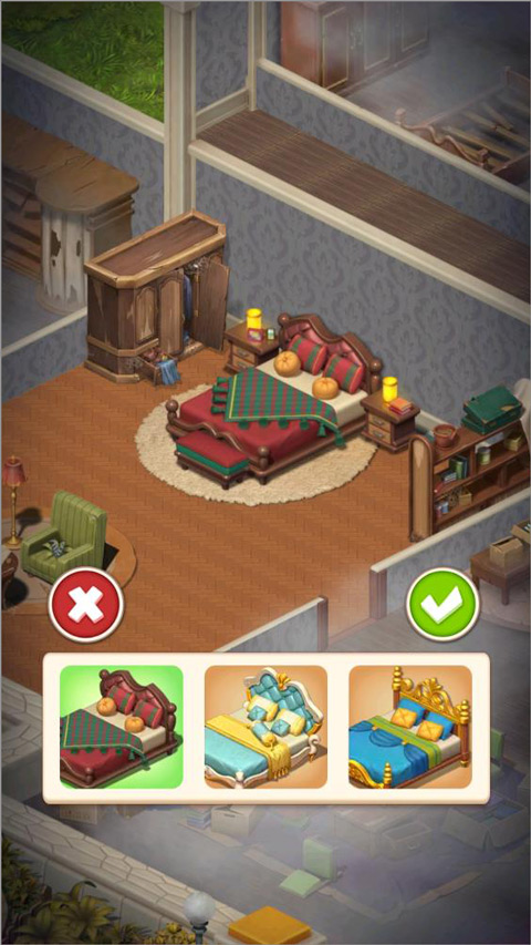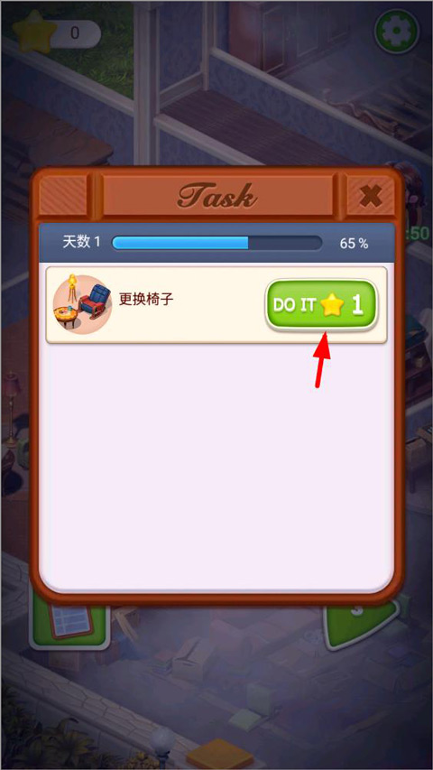清洁完成后,下一步是更换老旧的家具,如椅子、床铺、柜子等。每一次装修升级,都需要你挑战相应的三消关卡,合成靴子、火堆、房子等关键道具,并用星星兑换所需物品。