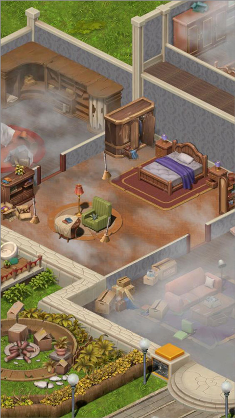 踏入庄园内部,你会发现房间积满灰尘、家具破损不堪。从卧室开始,你需要通过消除任务清理污垢。例如,根据提示消除15个红心即可获得一颗星星,用以兑换清洁工具。