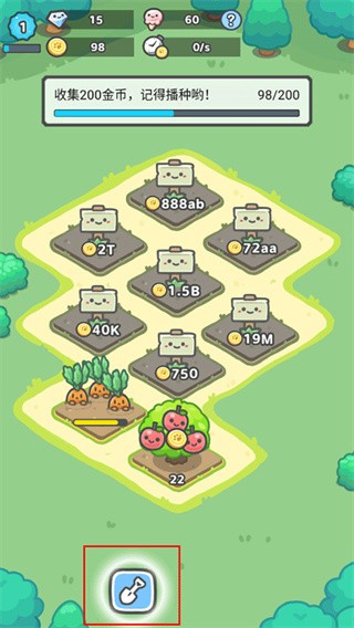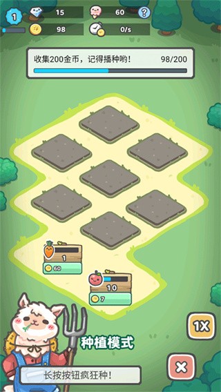 点击屏幕下方的铲子图标,即可切换至种植模式。长按按钮还能触发“疯狂种植”功能,大幅提升耕作效率,让你的农场瞬间绿意盎然。