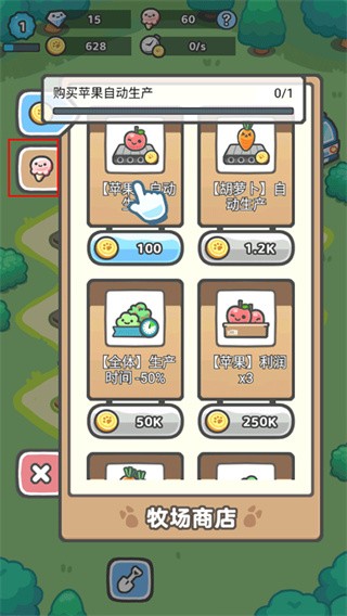 在左上角的“牧场商店”中,你可以用金币购买自动化道具,例如“苹果自动产生”,还能投资雪糕生产线并升级指数,实现收益倍增,彻底解放双手。