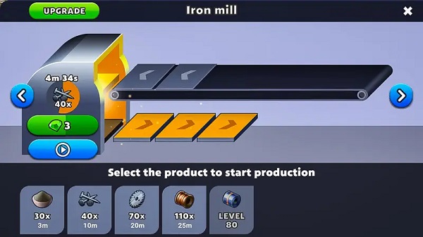 从基础的冶炼厂(矿石+煤炭→钢铁)起步,随等级提升解锁锯木厂、化工厂等多元设施。每个工厂设有多个“传入”与“传出”槽位,支持排队生产和临时仓储,还可通过宝石扩展容量,构建高效供应链。