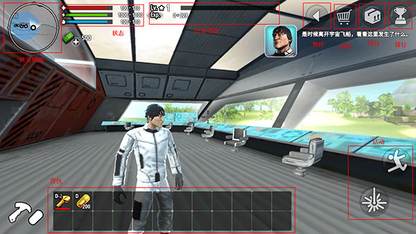 如图所示,游戏界面集成移动控制、地图导航、状态查看、商店访问、背包管理及排行榜等功能,操作直观便捷。