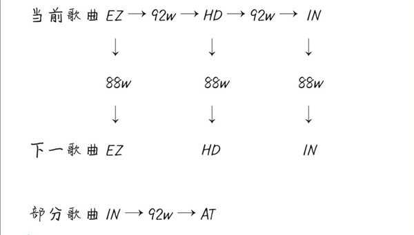 - 将上一首歌曲的对应难度打到A级(88万分以上),可解锁下一首歌曲的同级难度。