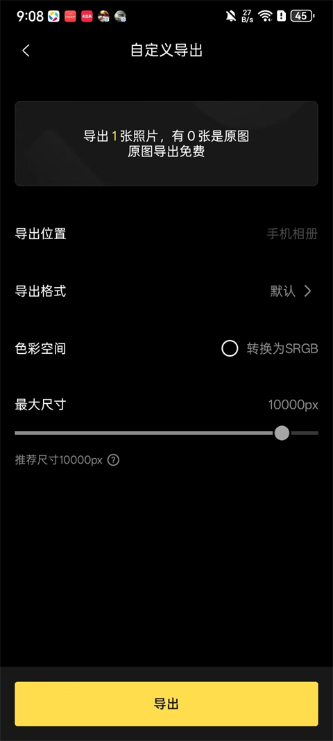 点击【导出】,自由切换【快速导出】(直达手机相册,即存即用)或【自定义导出】(指定存储路径、输出格式(JPG/HEIC/ProPhoto RGB)、最大边长、色彩空间等),严控交付品质标准。