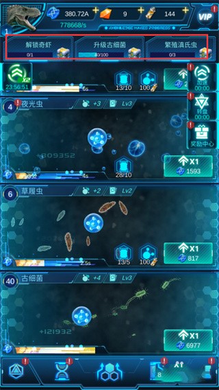 4、顶部实时显示当前纪元核心任务(如“解锁5种奥陶纪生物”),完成后开启宝箱,获取稀有化石碎片与加速道具。