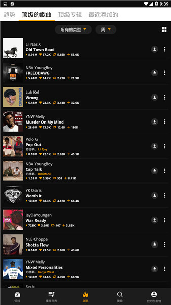 精准发现新声代——实时追踪全球趋势榜,一键收听最新发布的单曲、EP与混音带,做朋友圈第一个分享的人;