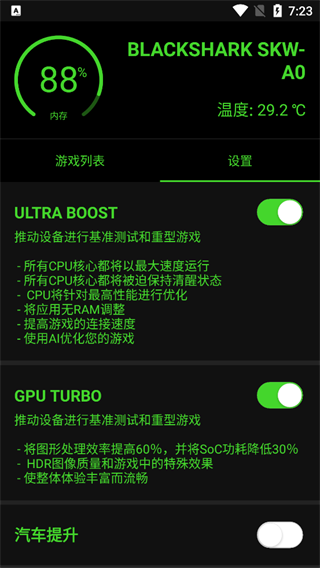 3、进入游戏专属设置页,一键启用【ULTRA BOOST】与【GPU TURBO】双核模式