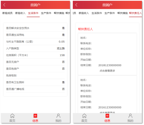 3、我的信息——家庭档案随身带 点击底部“信息”栏,即可查看完整户档:含户基础信息、所有家庭成员详情、年度收支明细、耕地/住房/饮水等生产与生活条件、当前享受帮扶措施及责任人联系方式,数据权威、更新及时、隐私加密。