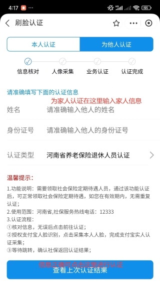 打开支付宝 → 搜索栏输入“豫事办” → 点击进入官方小程序 → 点击红色醒目标识的“社保资格认证”入口 → 确认关联本人信息后点击“前往认证” → 选择“本人认证”或“为他人认证” → 填写待认证人员基本信息,认证类型选“河南省养老保险退休人员认证” → 进入人脸识别环节,按提示完成面部拍摄与指定动作 → 实时反馈认证结果,全程自动存档、永久可查。