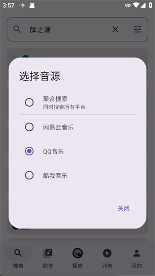 以搜索【薛之谦】为例,若当前音源为QQ音乐,App将直接呈现《其实》《演员》等热歌,点击任意一首立即播放,全程320kbps无损音质直送耳畔。
