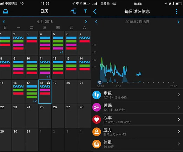 【日历】功能以直观日历视图整合全月运动轨迹,点击任一日期,即可展开当日完整运动记录,包括类型、时长、强度、GPS轨迹等详细信息。
