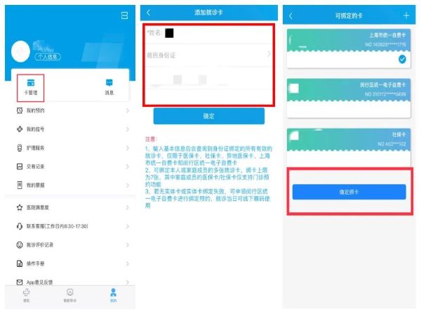 1. 进入【我的】→【卡管理】,添加并绑定“闵行区统一自费就诊卡”(接种疫苗必备);