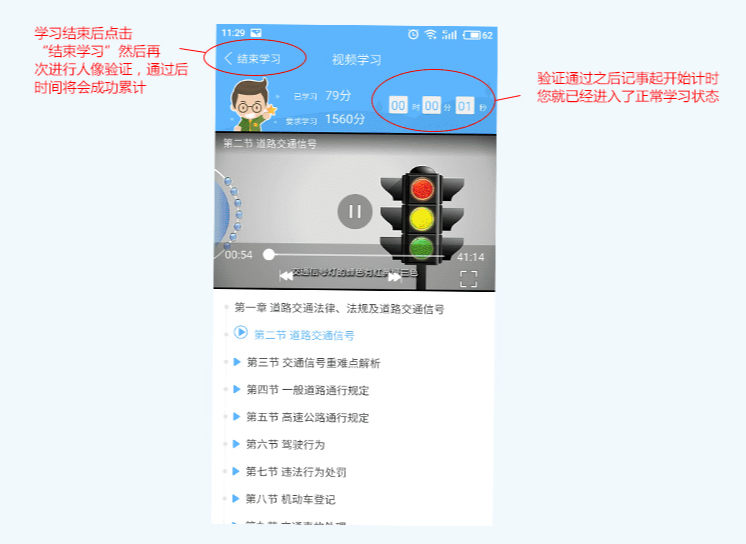 点击首页【理论学习】模块,完成人脸识别验证后,系统将自动启动学时计时(显示为“00:00:00”且数字跳动即代表有效记录中)。全程无需手动操作,学时数据实时同步至驾培监管平台,确保学习过程真实、合规、可追溯。