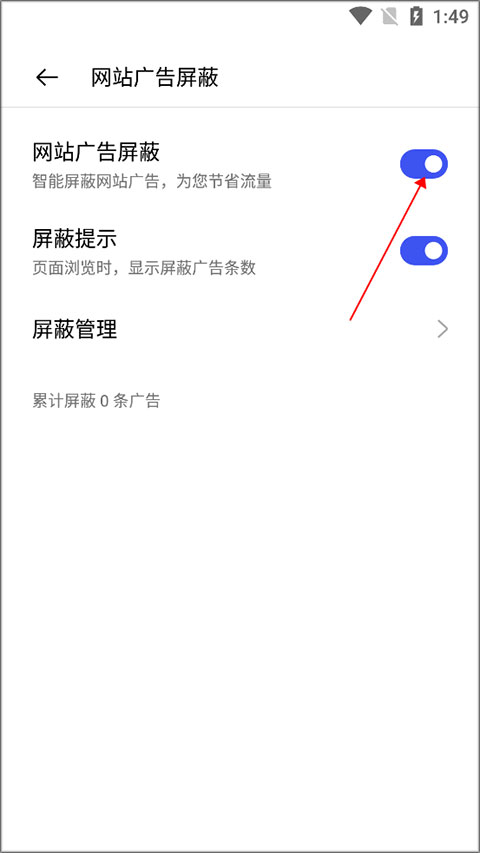 广告干扰阅读?关闭只需四步:首页点击底部菜单栏→进入【设置】→找到【网站广告屏蔽】→开启右侧开关。启用后,主流网页广告(含弹窗、贴片、信息流推广)自动过滤,页面加载更干净,阅读更连贯。