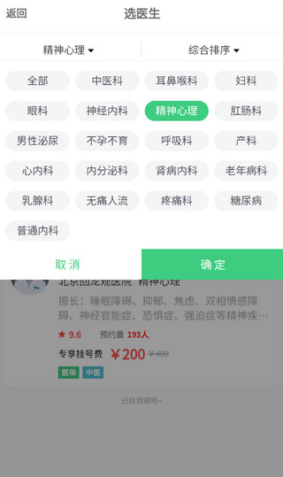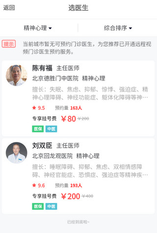 5、浏览该科室下的医生列表;若当前医院无合适号源,可切换至其他医院继续选择。